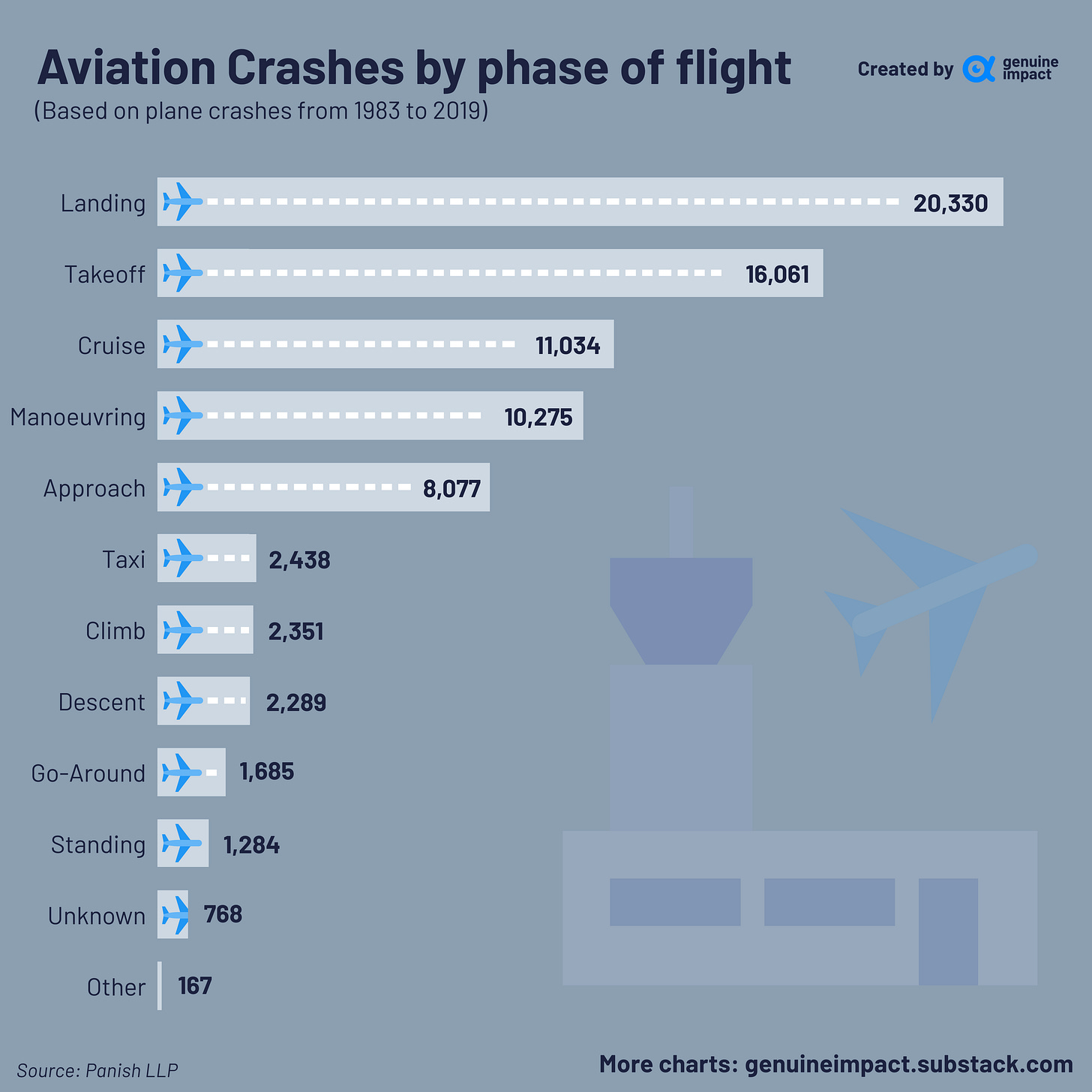 Landing and takeoff are clearly the most dangerous phases of the entire flight which is unsurprising due to a combination of factors. These phases occur at relatively low altitudes which gives the pilot less scope and time to recover from errors or malfunctions. Also, at these times the pilot requires intense concentration and coordination due to having to complete multiple tasks. Therefore, this leaves more room for human error too.